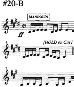 This is the concluding section of the sequence. It begins on mandolin for m.1-18, which I played exactly as written. There’s a change to guitar at m.19-20, and although the score says there is “[TIME]”, it’s actually a quick instrument change. The guitar plays only for m.21-24, and I played the part exactly as written. Even though this ends the sequence, there’s an applause segue into the next number.