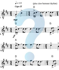 Here’s another excerpt, this time from the song “Bright Star”. This time the tuning is Double-C on the standard 5-String Banjo, with a capo at the 2nd fret and the drone string tuned to A. The score provides only the capo setting, and includes no detail at all on what to play – just slash marks and chord symbols.