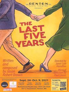 I have played two productions of The Last Five Years. The first, in 2016, was for SecondStory Repertory in Redmond. I was itching for a chance to play the show and was very grateful for this gig. Music Director Julia Thornton was very patient with me during rehearsals as I got to grips with the material. More recently I played show for Renton Civic Theatre in September-October 2021, with music director Paul Linnes. This was a particularly fulfilling experience, partly because I brought five additional years of experience to my performance, but also because it was my first pit work after an 18-month enforced break due to the Covid-19 pandemic and we had a great pit ensemble.