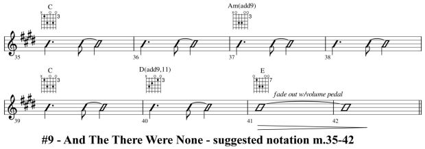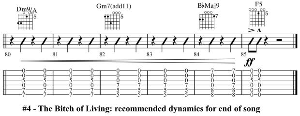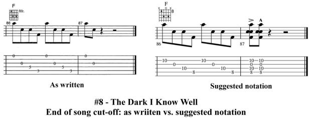 - Chords and cut off at end of song: at the end of the song (m.87) there is a cut-off consisting of two eighth-notes, which are written as a continuation of the arpeggio pattern from the previous measure. This should probably be a pair of strummed chords, as shown below. This can be heard on the 2021 Reunion Concert recording.