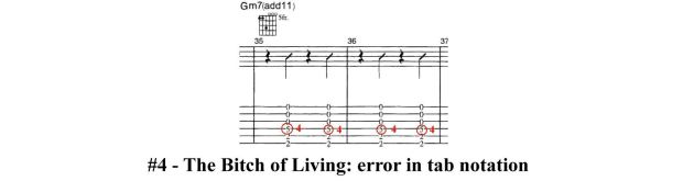 - Errors in tab notation: the tab notation for m.21 is given as 2-2-5-0-0-0. This is incorrect. It should be 2-2-4-0-0-0. This error also occurs in m.22, 35, 36, 41, 42, 64, 65, 70, 71, 76, 77, 82 & 83 (that is, everywhere where this is a Gm7 (add 11) chord).
