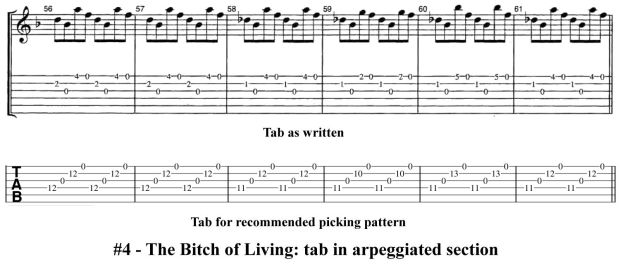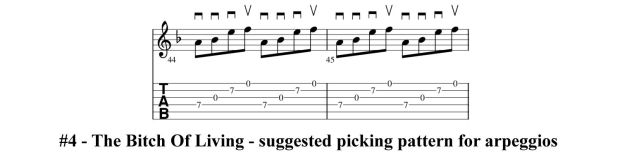 - Playing arpeggios: as for #4: The Bitch Of Living, I suggest picking the arpeggios in a circular motion, this time with three up strokes and one downstroke, as shown below.