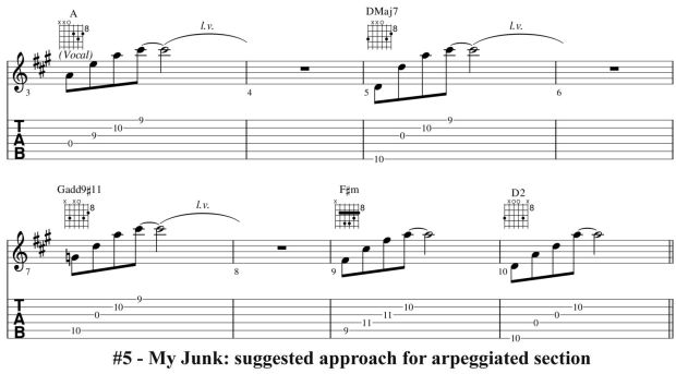 - 7th fret capo & tuning: this number requires a standard tuning with a capo at the 7th fret, while the previous number is a DADGAD tuning with capo at the 3rd There is very little time to make the required capo and tuning adjustments, and if the band is on stage this risks being distracting for the audience. I recommend using two guitars, one with DADGAD tuning and the other with standard tuning. Before the start of the show set the 7th fret capo for “My Junk” and check tuning after setting the capo. Re-check the tuning after removing the capo at the end of the song.