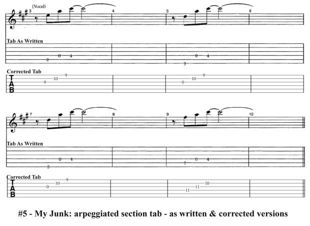 - Incorrect tab notation: the tab notation for the arpeggiated sections (the verses at m.3-18 and m.57-64) is written one octave too low. The excerpt below shows the original tab together with a corrected version.