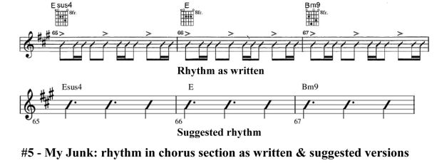 - Rhythm too busy: the eighth- and sixteenth-note rhythm patterns for the choruses are too busy for a distorted electric guitar; they are more suited to an acoustic. Playing them as written leads to a muddy overall sound. Conversely the corresponding chart for Guitar 1 (acoustic guitar) is not rhythmic enough. It’s almost as if the parts ought to be reversed. On the Broadway recording, this is more or less what happens. The acoustic guitar plays a busier, more percussive rhythm, which locks in well with the percussion, while the electric guitar plays a simpler rhythm providing a warm, fuzzy base to fill out the sound. I recommend this approach. The excerpt below shows part of the chorus as written, and the suggested version (as recorded on the Broadway cast album). Notice that the beats of the recorded part match the accented notes of the chart as written; the recorded part has just been simplified to provide a clearer overall sound and not stifle the vocals.