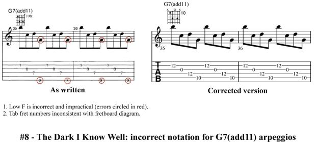 - Incorrect tab notation: the tab and standard notations for the G7(add11) arpeggios at m.27, 28, 35, 36, 60, 61, 68, 69, 72, 73, 76, 77, 84 and 85 are incorrect. The low F is impractical to play and should be a G, as shown in the fretboard diagram.