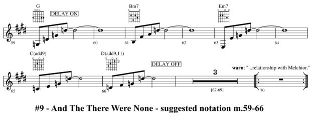 - m.59-66: the original chart calls for arpeggios and provides chord symbols and slash rhythm notation, except at m.66 which is entirely incorrect. The suggestion below provides suggested arpeggios in full, and is similar to what can be heard on the 2021 Reunion Concert audio.