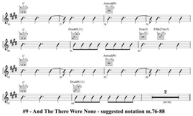 - m.76-88: the original chart provides six measures of rhythm notation and chord names before returning to slash marks. The suggestion below provides a complete suggested rhythm pattern and chord voicings (which are similar to those used earlier in the song). Once again it is fairly similar to what can be heard on the 2021 Reunion Concert audio. It fits well with the Guitar 1 and Drum parts.