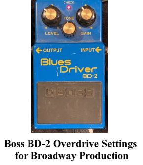 - Uncertain effects settings: the chart includes a diagram showing settings for a distortion pedal, but doesn’t tell you which pedal was used, or what the knobs are, making it effectively useless. Olivier Manchon, who played the book in the original Broadway production, was kind enough to inform me that the “Distortion” pedal was in fact a Boss BD-2 Blues Driver See the notes on effects pedals below for more details.