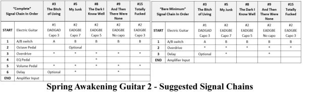 Recently I was contacted by a Chicago-based violinist who wanted to talk about the Guitar 2 parts for Spring Awakening. I had not previously studied the parts in detail, beyond working out how to cover them using only one guitarist, and I was surprised to find that while the parts are not difficult to play, the charts are a hot mess. In this article, I review the guitar parts in detail, highlight inconsistencies and errors in the charts, provide clarifications, suggest improvements and offer tips on playing the songs. I also provide guidance on guitar tones and effects pedals.